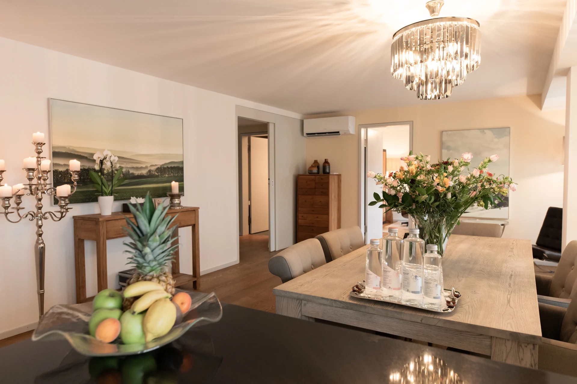 The living room of your private penthouse apartment is designed as a serene and inviting sanctuary. Softly furnished and thoughtfully arranged, it provides a space to relax, reflect, and engage in therapy.